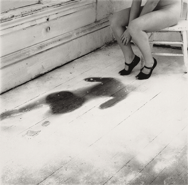 Deutlich öfter als, nennen wir es, einen erzählerischen Zugang zur Fotografie, findet sich im Werk von Francesca Woodman jedoch ein Arbeiten mit formalen Entsprechungen. Immer wieder nutzt sie ihren Körper, um Formen, sei es die Gestalt des Raumes, sei es ein mitgebrachtes Requisit, seien es die Natur, nachzuzeichnen. Sie windet sich wie ein Aal in der Schüssel, sie verwandelt ihre Hände in Baumstämme (eine Daphne-Variation?), sie folgt mit ihrem Körper den Wänden und der Ecke eines Raumes und setzt ihn in ein Verhältnis mit menschlichen Dimensionen. Eine Weiterentwicklung finden diesen Fotografien im Künstlerbuch „Some Disordered Interior Geometries“: Die Euklidsche Geometrie wird dadurch eine Prüfung durch den Körper unterzogen, auf Berechnungen von Dreiecken folgen Raumecken in Relation zum menschlichen Körper.