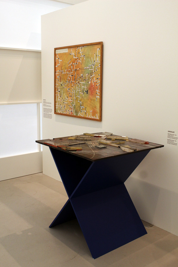 Während Hundertwassers „167 Die Stadt“ (1953) mit einer von Horizontalen und Vertikalen bestimmten Struktur an Werke von Corneille „Abstract Composition“ (1948) oder Constants „New Babylon Nord“ (1958) erinnert, zeigt „224 Der große Weg“ (1955) eine der berühmten Spiralen. Neben Letzterem präsentieren die Kuratoren Krejci und Höhne John Cages „Fontana Mix“ (1958), Hundertwasser hatte den amerikanischen Musiker 1949 in Italien kennengelernt. Etwas weiter findet sich Piero Manzonis „Linea m 15,81“ (September 1959), wobei die titelgebende Linie mit Tusche auf Papier gezeichnet und in einer Kartonhülse zu einer unsichtbaren Spirale gerollt ist. Die italienische Avantgarde ist zudem durch so unterschiedliche Künstler wie Giuseppe Capogrossi und Lucio Fontana vertreten.