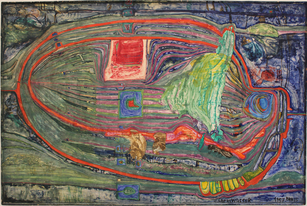 Dann suchte der Künstler in einigen Stellungnahmen seine Ideen zu vermitteln: Er betonte die unabhängige Entwicklung des österreichischen Surrealismus, und dass „im Malen selbst deren Sinn“ bestehe. Nicht das Endprodukt oder gar das Motiv, obwohl man mit Hundertwasser zurecht die Spirale verbindet, waren für den Maler interessant, sondern das Ausführen, der Weg, der bereits mit dem Anreiben der Farben begann. Der Prozess setzt sich in den Betrachter_innen fort, denn im Text „Der Transautomatismus, eine allgemeine Mobilmachung des Auges“ (Paris 1956) fasste Hundertwasser folgende Gedanken: „Das unbewegliche transautomatische Bildobjekt (Tao) muss zu einem beweglichen Bild, das heißt zu einer Bilderfolge im Inneren des Beschauers, den Anstoß geben, sonst bleibt das Tao unsichtbar. Dieses Individualkino bestand schon seit eh und je im Unterbewusstsein und ist zufolge der vertiefenden Intervention der neuen Pflichten und Rechte der modernen Kunst in den Aufgabenbereich des Bewusstseins und des Gewissens gerückt.“ (zit. nach AK Belvedere S. 75)