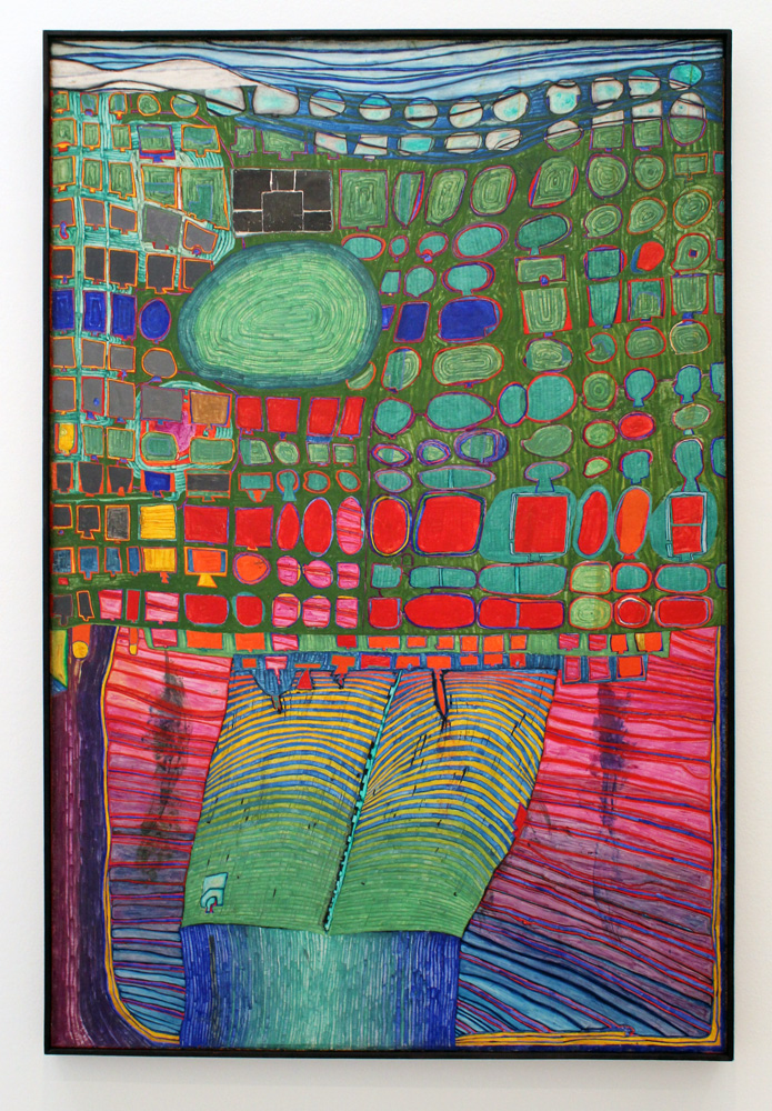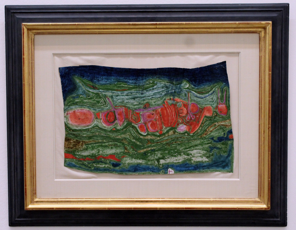 Wenn in der Schau auch Friedensreich Hundertwassers malerischer Sonderweg innerhalb der Avantgarde deutlich wird, so gelingt es doch, die gemeinsamen Wurzeln herauszuarbeiten. In den 50er Jahren ging es um die Überwindung des Informel (Tachismus), das Prozesshafte des Gestaltens und das Aufnehmen naiver Zugänge. Die Künstler wurden zu Akteuren in ihrer Kunst aber auch zu Selbstdarstellern ihrer Ideen. Hundertwasser befand sich in den 1950ern am Hotspot Paris, nahm alle Einflüsse auf und erfand 1953 die doppelte Spirale als Symbol für die Vereinigung von Gegensätzen. Wie die Autoren im Katalog richtig bemerken, ist mit dieser Schau erst ein allererster Schritt getan. Dass sich Hundertwasser zu den aktuellen politischen Veränderungen in Asien künstlerisch äußerte, wird mit drei kleinen Arbeiten auf Papier angedeutet: „Ho-Chi-Minh träumt von Österreich / Das imaginäre Haus“ (1963) zeigt den Präsidenten Nordvietnams in seiner einfachen Holzhütte. Im Gegensatz dazu wird die Besetzung Tibets durch die Chinesen in „Dalai Lama – Flucht mit durchbohrter Spirale“ (1959) sowie „Regen über China in Flammen“ (1958) verklausuliert aber dennoch eindrücklich umgesetzt. Hier ist deutlich ein Forschungsauftrag enthalten, der das Verhältnis von Hundertwasser und Asien klären helfen wird. „Hundertwasser, Japan und die Avantgarde“ macht dieses Desiderat sichtbar. Gleichzeitig wird geklärt, dass das Frühwerk von Hundertwasser nur im Sinne einer Weltkunstgeschichte entschlüsselbar ist. Wenn er auch eigene Wege beschritt, so war Hundertwasser kein Einzelgänger.