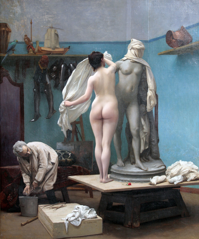 In den 1880er Jahren wandte sich Gérôme der bunten Marmor- und Bronzeskulptur zu und thematisierte diese auch in seinen Gemälden. Das Geschehen im Atelier, der Vergleich zwischen Modell und auszuführender Statue (in Fotografie und Malerei), der Pygmalion-Mythos, die Farbigkeit der antiken Statuen, welche der Skulptur erst Leben einhaucht, wurden auch zu wichtigen Sujets des alternden Malers. So zeigt er sich die Werkzeuge reinigend, während eine nackte Schönheit eine noch unvollendete Statue der Omphale verhüllt. Als Gérôme 1904 im Alter von 80 Jahren in Paris verstarb, ließ die Familie ein Bildnis des Maler-Bildhauers neben seine bronzene Gladiatoren-Gruppe anbringen. Ein würdiges Monument für diesen romantischen Erzähler, das heute die Besucher vor der Ausstellung bereits auf das zu Erwartende einstimmt. Im Sinne der alten Römer: Daumen hoch!
